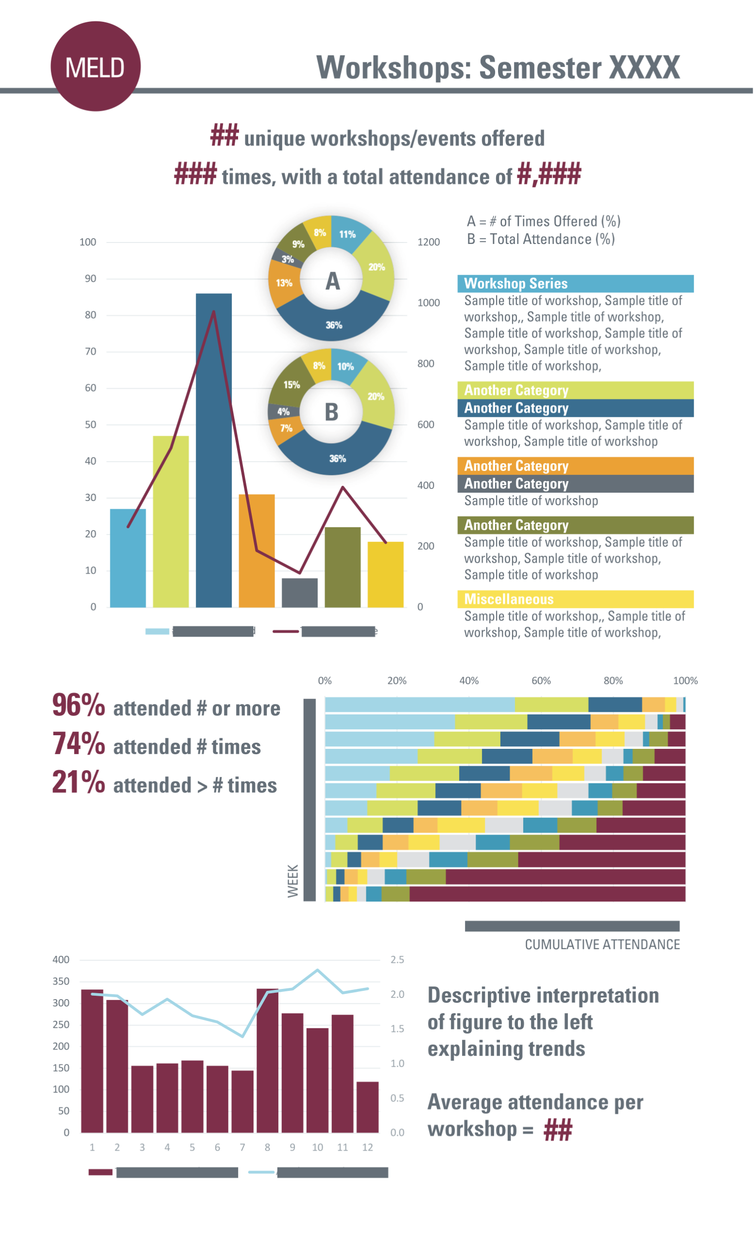 CAPTION: These are infographics I created to share results with stakeholder. The first is for the campus-wide program launch; the second is for a closely related bridging program for ESL students who did not meet the university’s language proficiency standards. I have removed the actual category titles and numbers for privacy.
